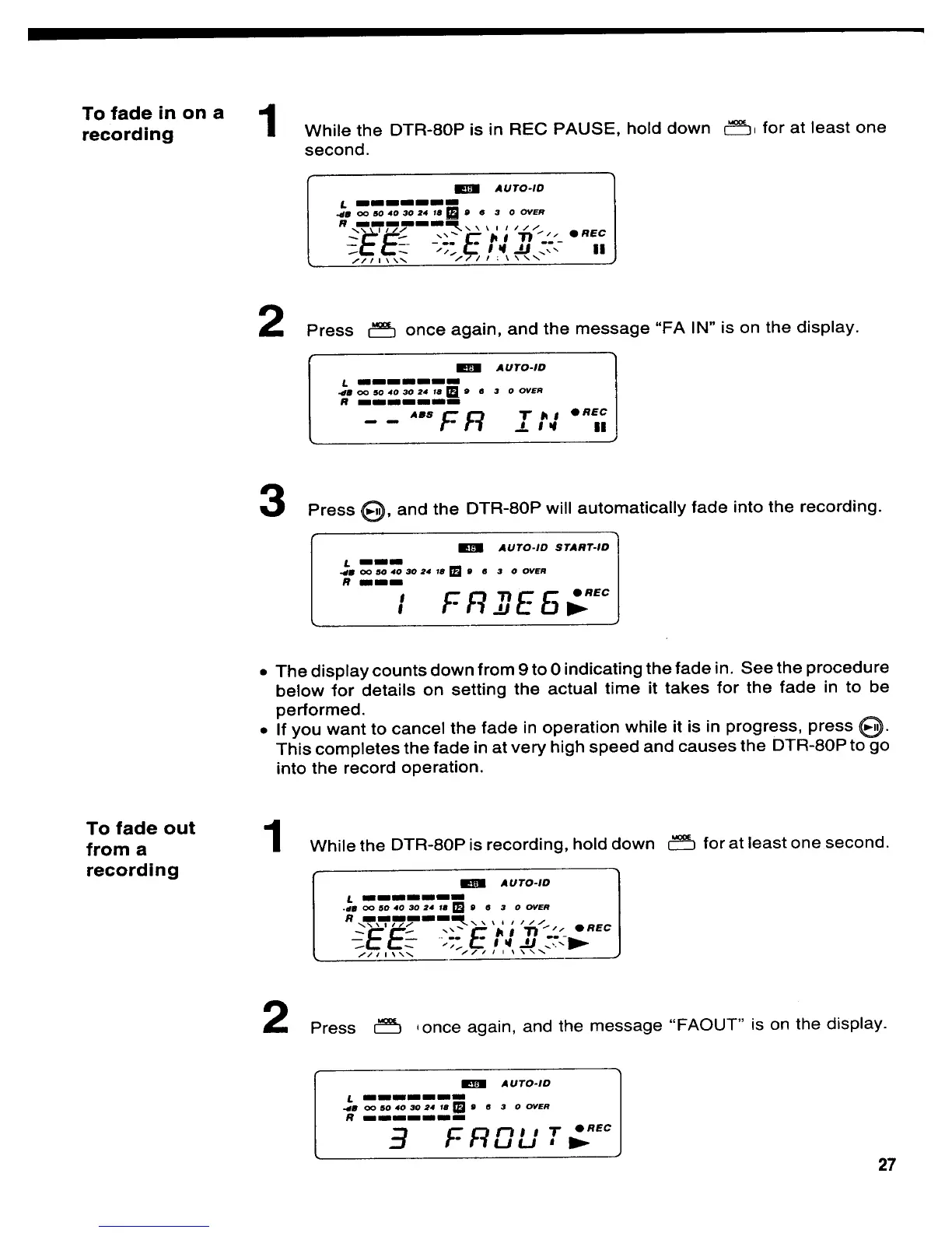Denon DTR-80P - Fade In and Fade Out Recording; Performing a Fade-In Recording; Performing a Fade-Out Recording