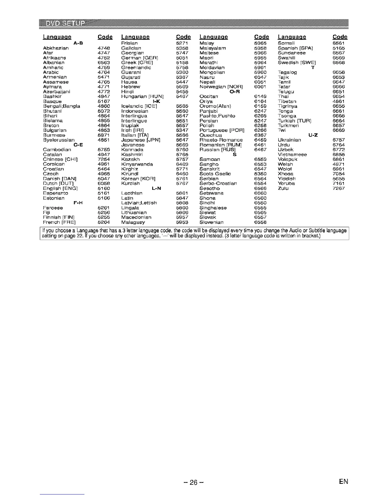 setting on page 22. Ifyou choose any other languages, -_-will be displayed instead. (3 letter language code is wdttan in bracket.)