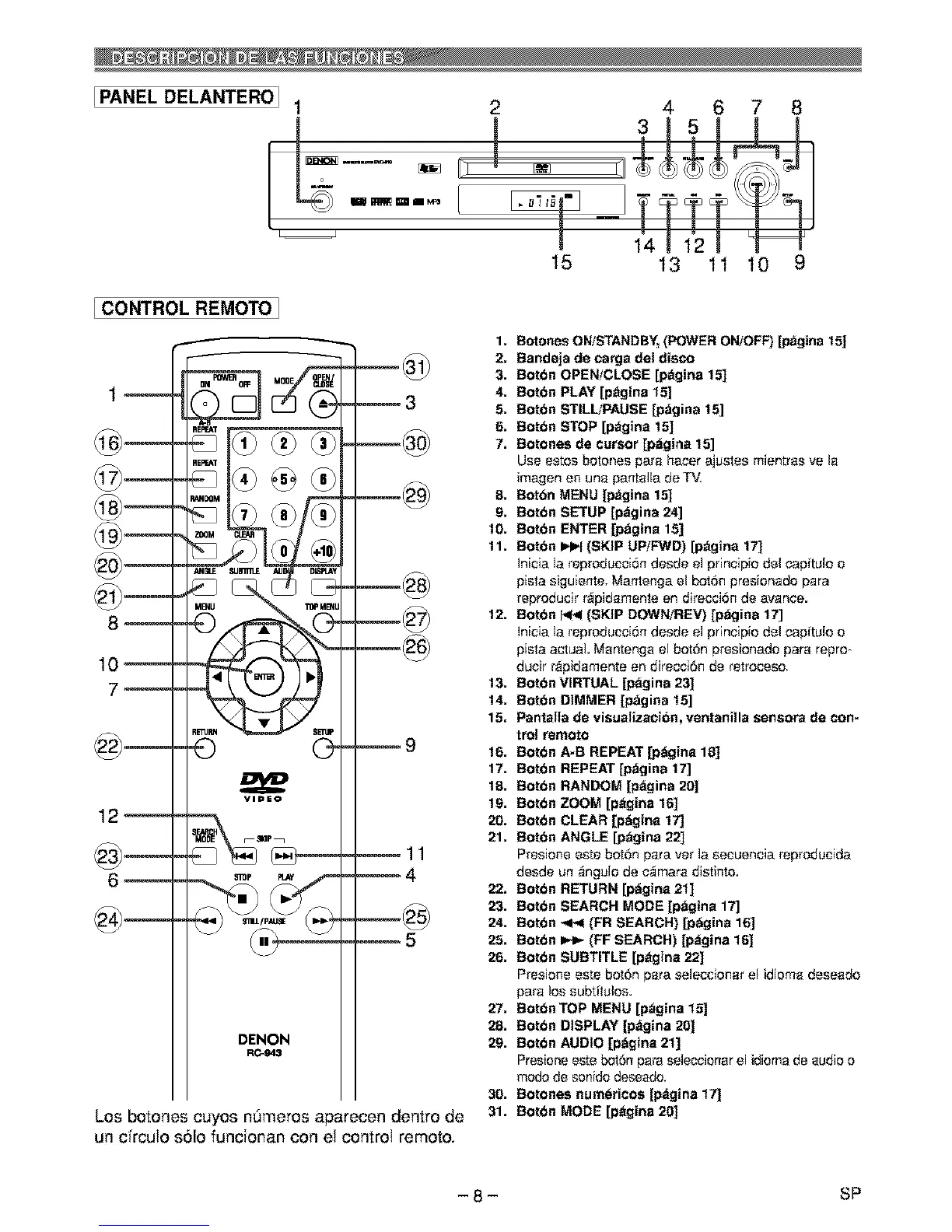 1. Botones ON/STANDBY, (POWER ON/OFF) [pdgina 15]