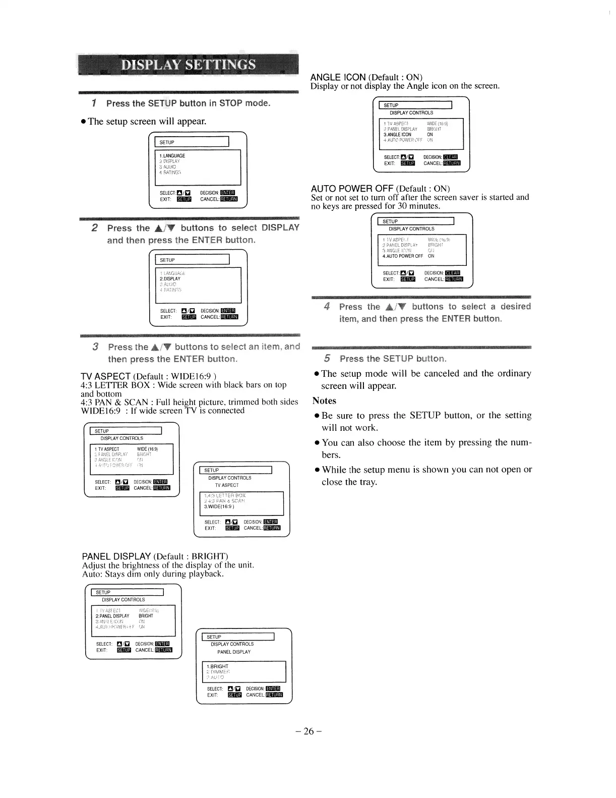Denon dvd900 - Display Settings; TV Aspect; Panel Display; Angle Icon