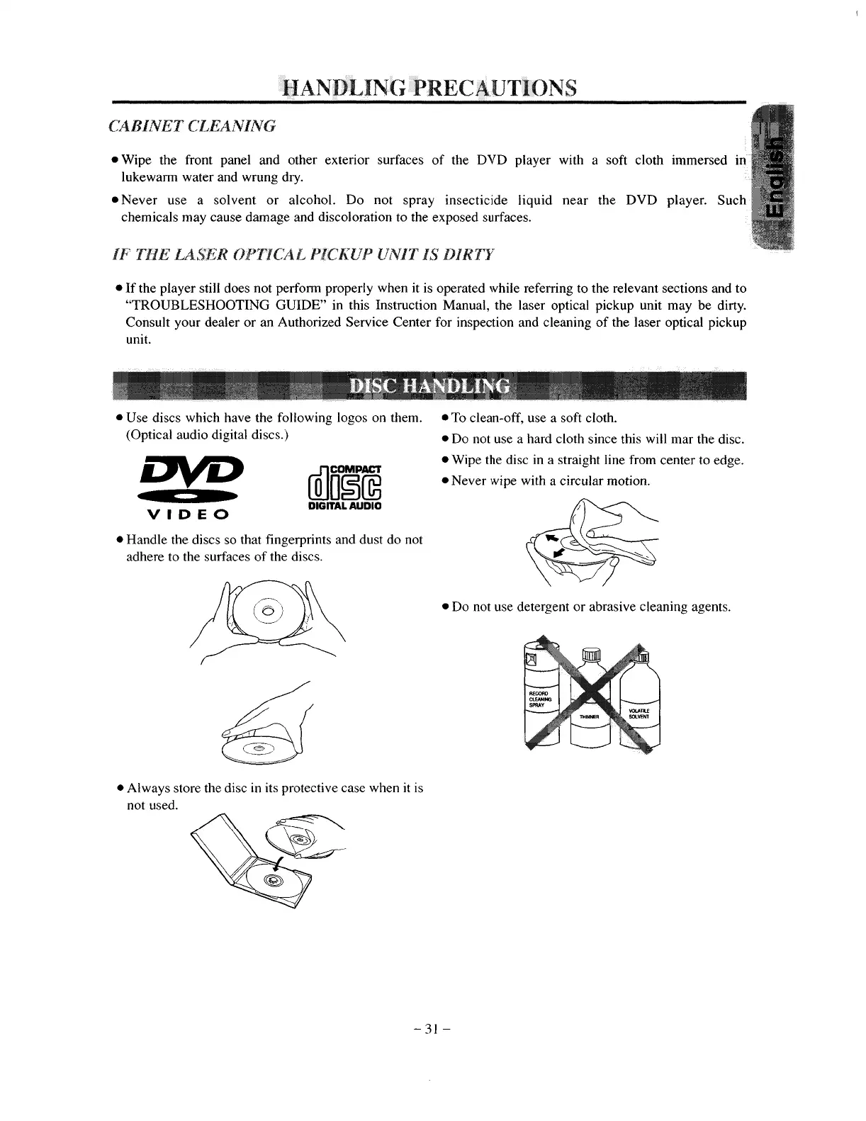 Denon dvd900 - Handling Precautions; Disc Handling; Cabinet Cleaning; If the Laser Optical Pickup Unit Is Dirty
