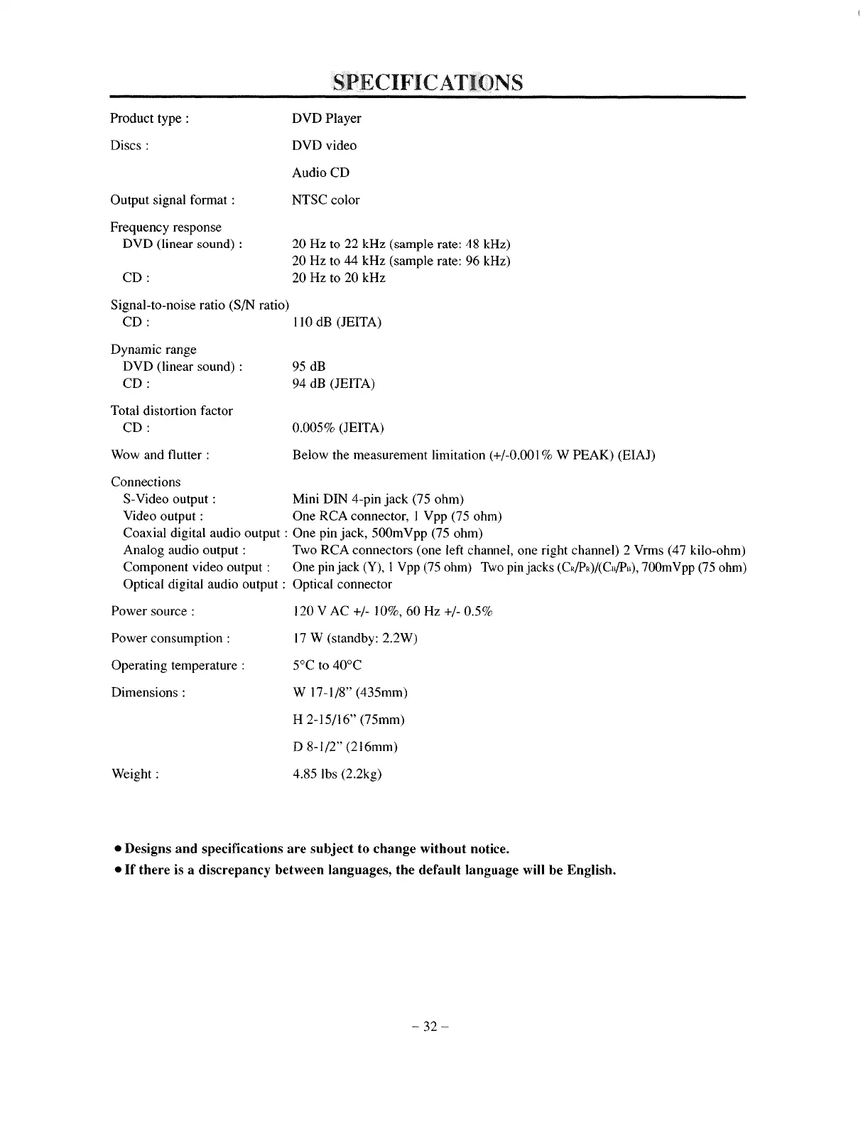 Denon dvd900 - Specifications