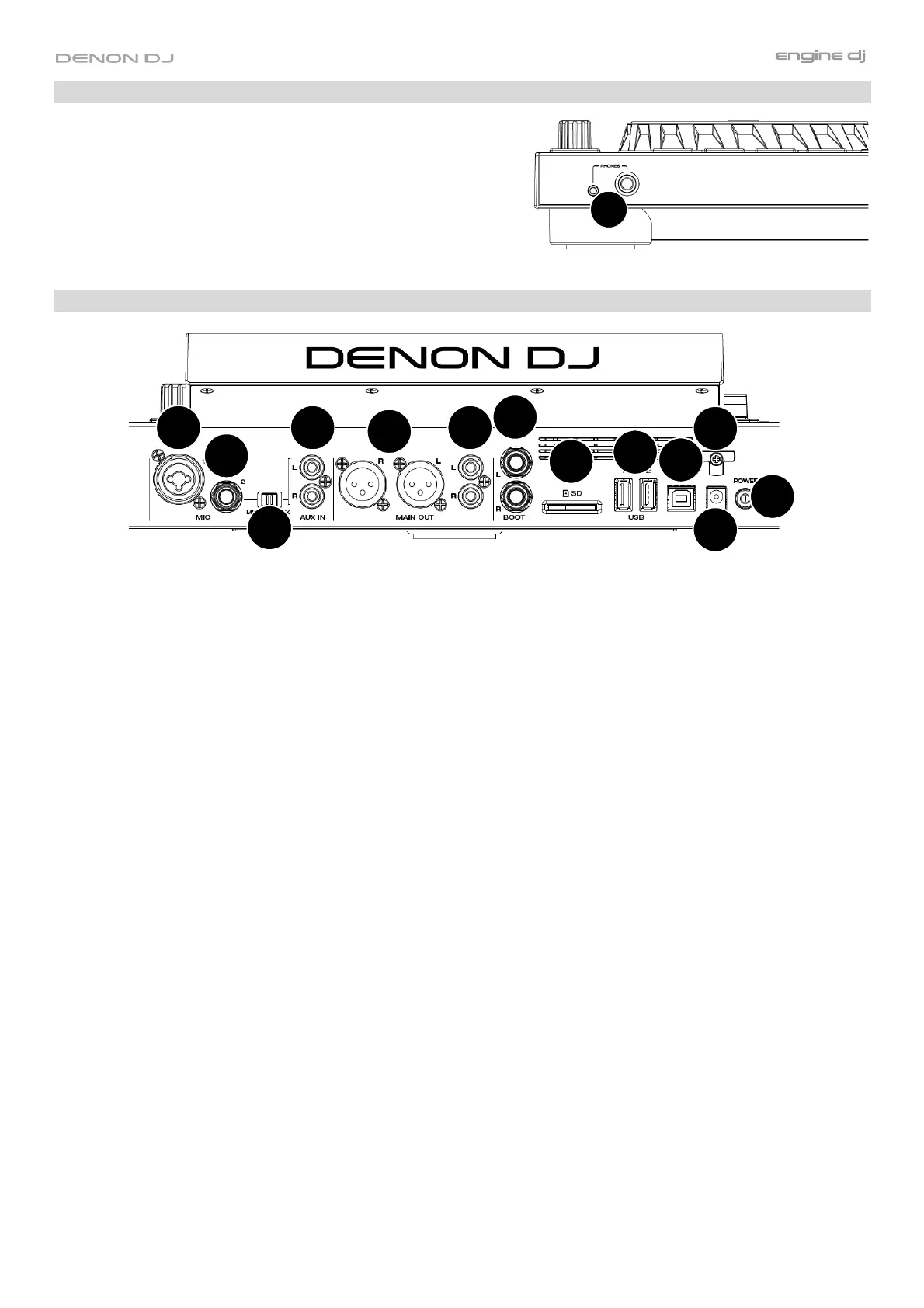 7. Booth Outputs (1/4” / 6.35 mm): Use standard 1/4” (6.35 mm) cables to connect these outputs to booth