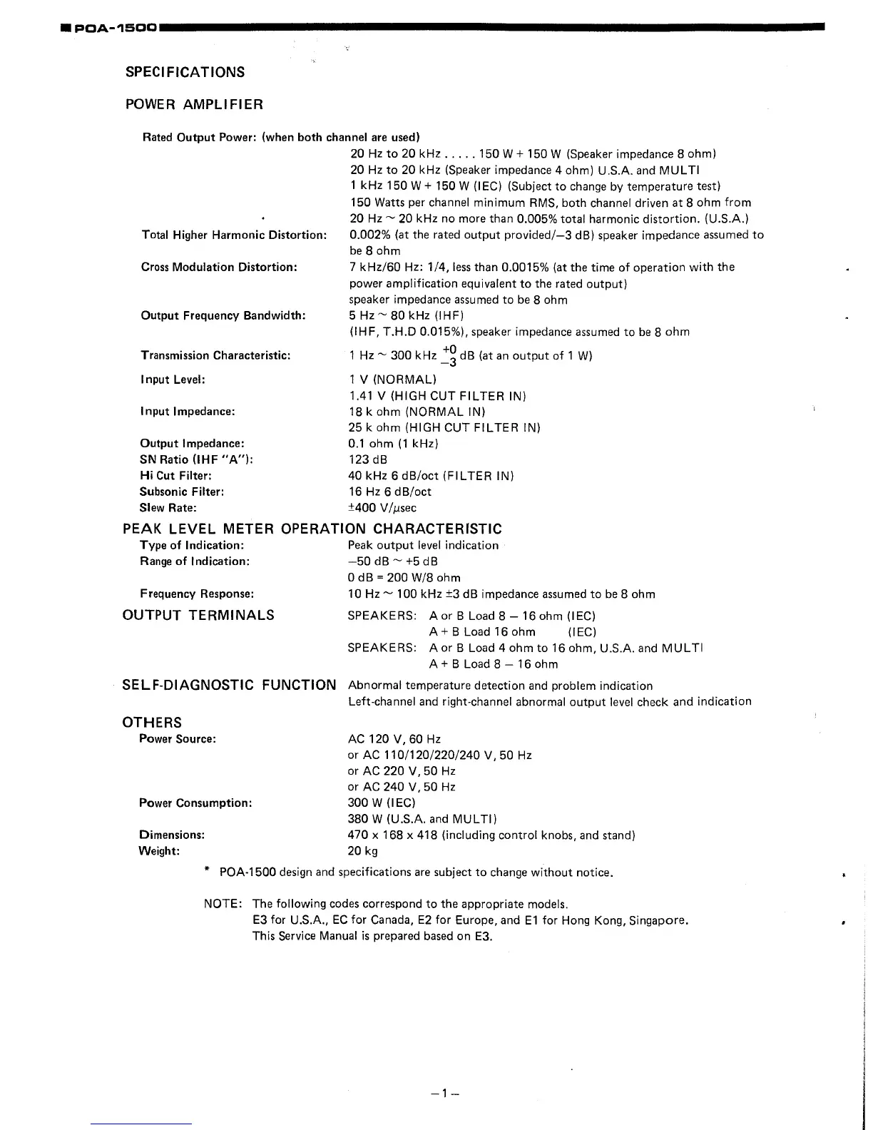 Denon POA-1500 - SPECIFICATIONS; POWER AMPLIFIER SPECIFICATIONS; PEAK LEVEL METER CHARACTERISTICS; OUTPUT TERMINALS