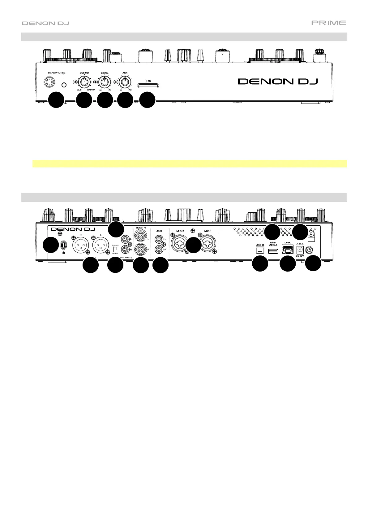 6. Booth Outputs (1/4” / 6.35 mm): Use standard 1/4” (6.35 mm) cables to connect these outputs to booth