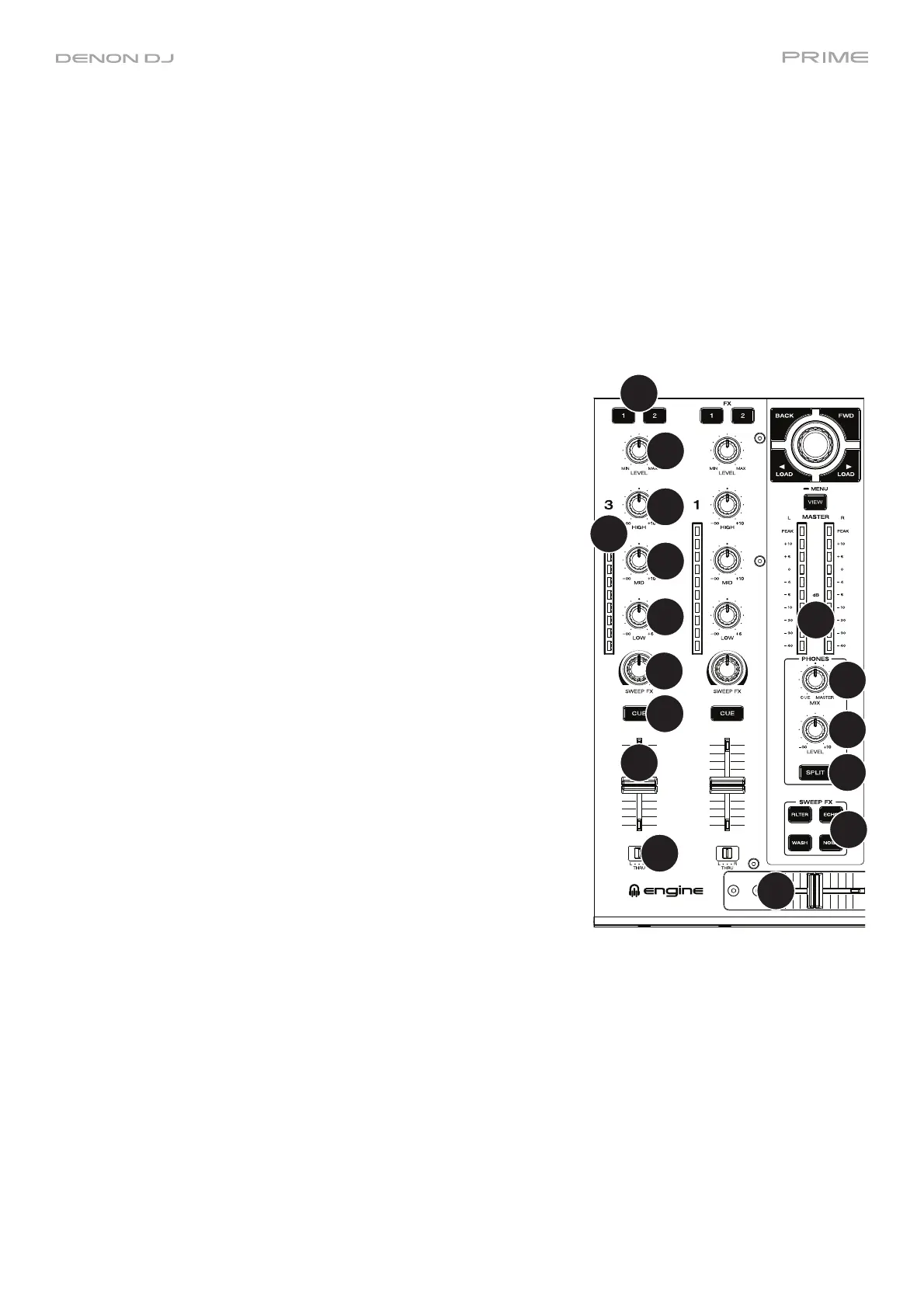 20. Split Cue: When this button is On (fully lit), the headphone audio will