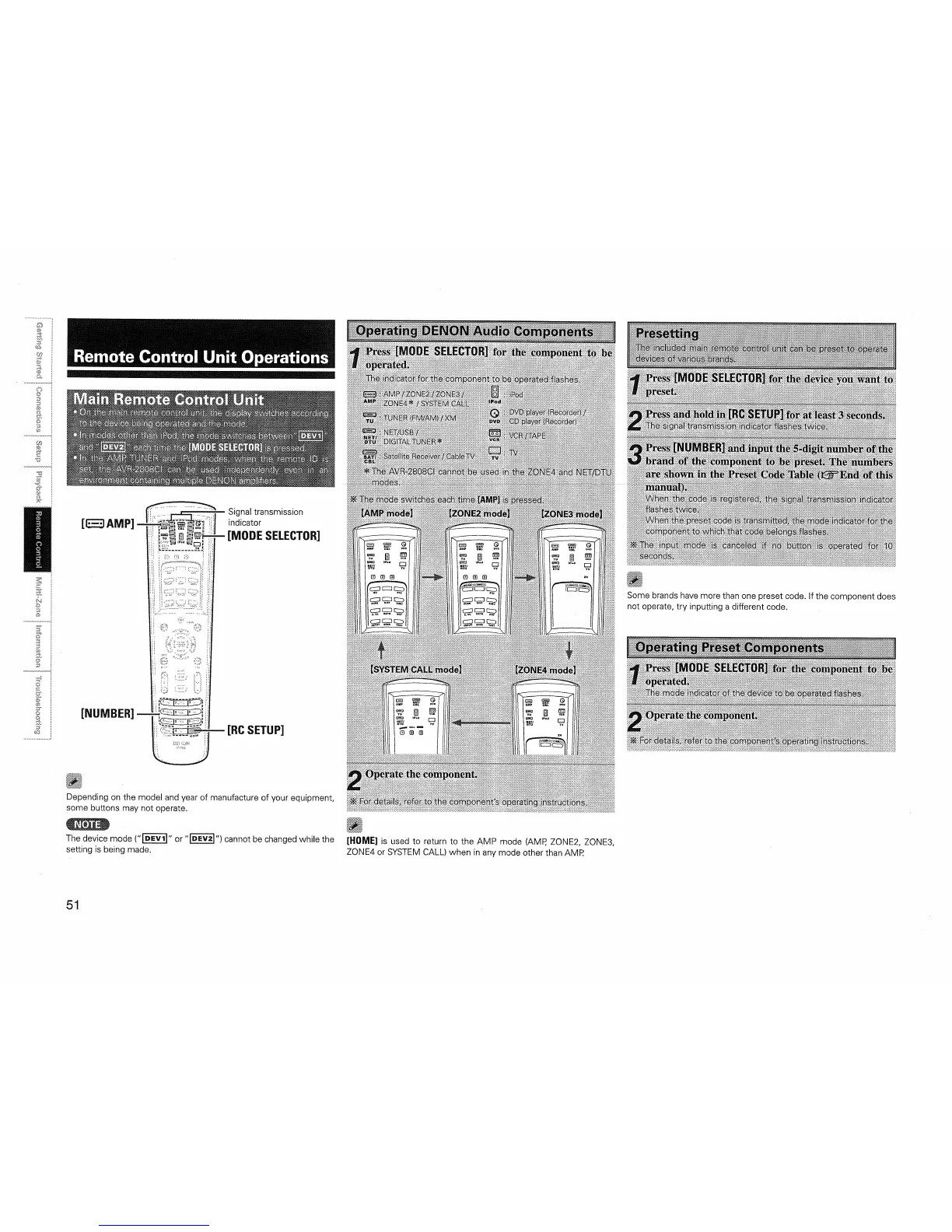 Denon RC-1068 - Remote Control Unit Operations; Operating DENON Audio Components; Presetting the Remote Control; Operating Preset Components