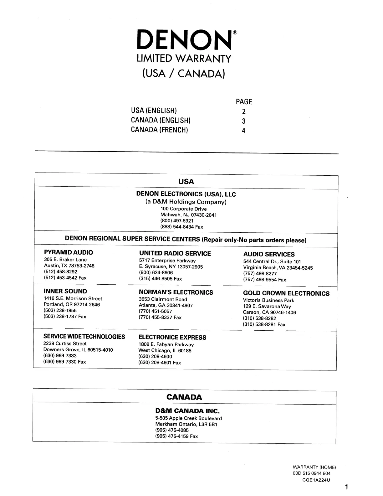 REGIONAL SUPER SERVICE CENTERS (Repair only-No parts orders please)