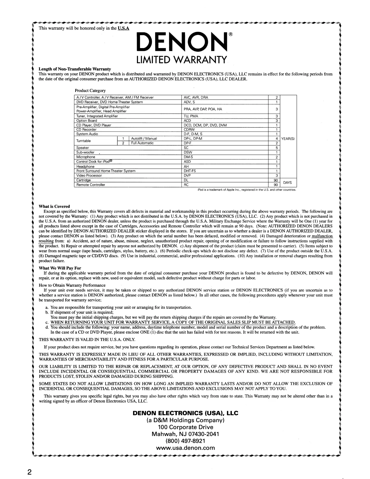 authorized DENON dealer, unless the product is purchased through the U.S.A. Military Exchange Service where the Warranty will be One