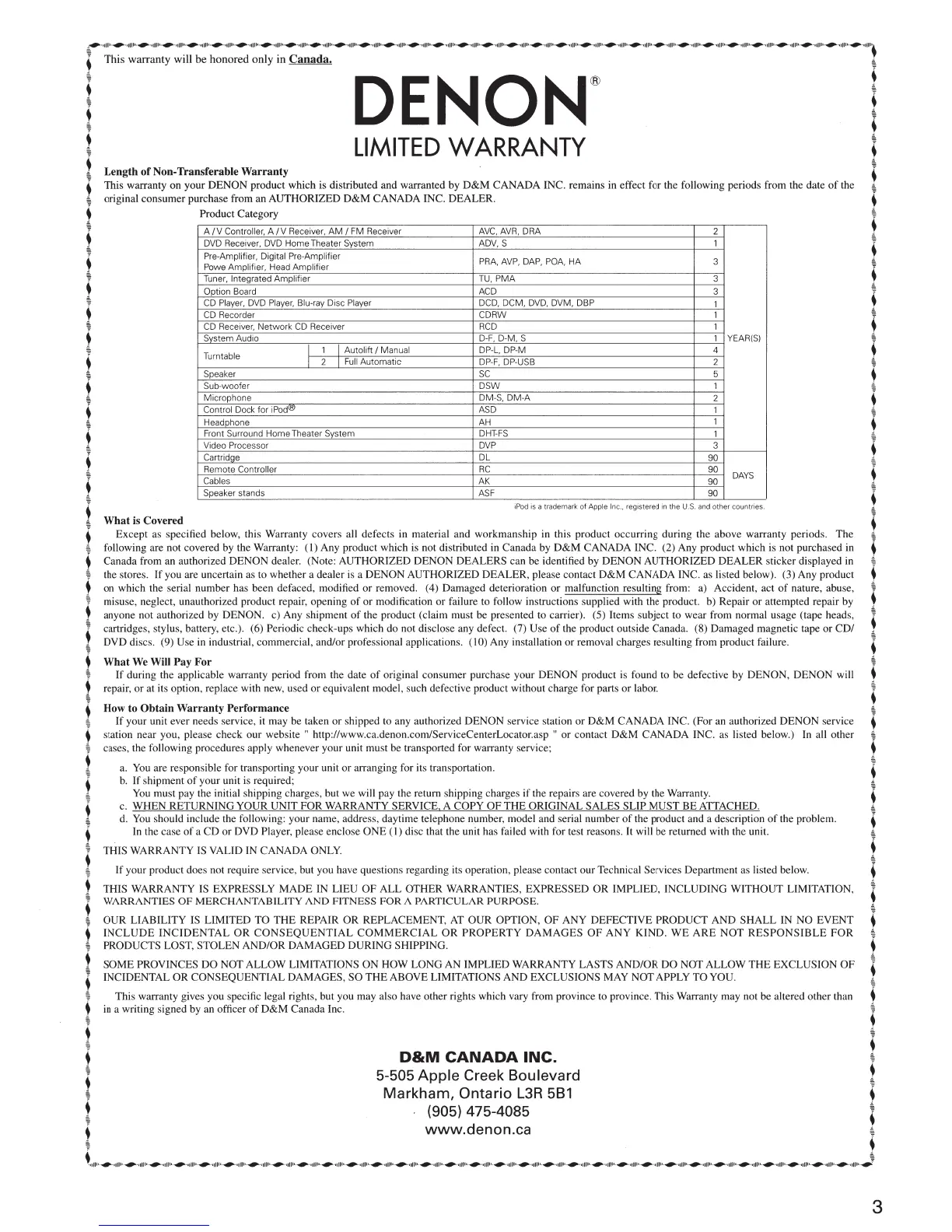 This warranty on your DENON product which is distributed and warranted by D&M CANADA INC. remains in effect for the following periods from the date