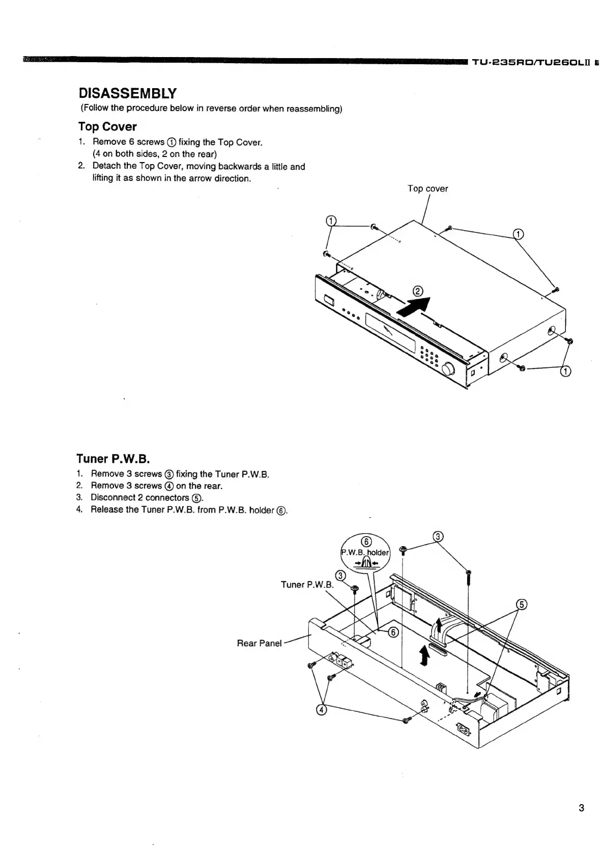 Denon TU-235RD - Disassembly Procedures; Top Cover Removal; Tuner P.W.B. Removal