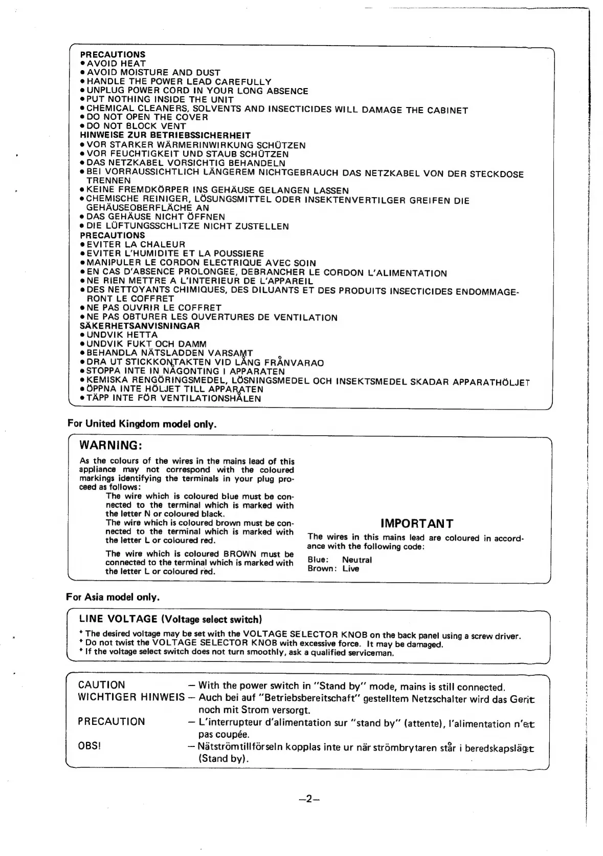 Denon TU-450 - Safety Precautions; General Handling and Environmental Safety; Electrical and Voltage Safety Guidelines