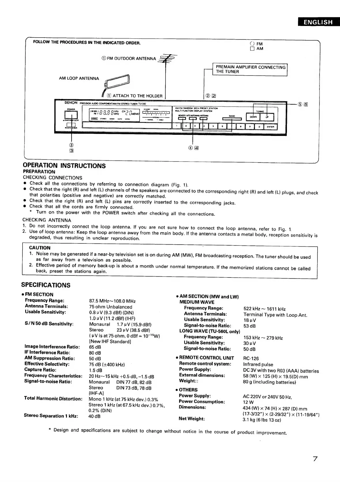 Denon TU-560 - SPECIFICATIONS; FM SECTION; AM SECTION (MW and LW); REMOTE CONTROL UNIT
