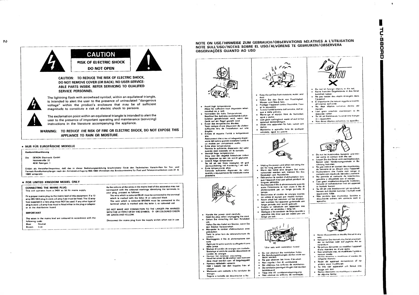 Denon TU-580RD - Safety and Usage Precautions; General Safety Warnings; Usage Environment Guidelines; Regional Compliance Statements