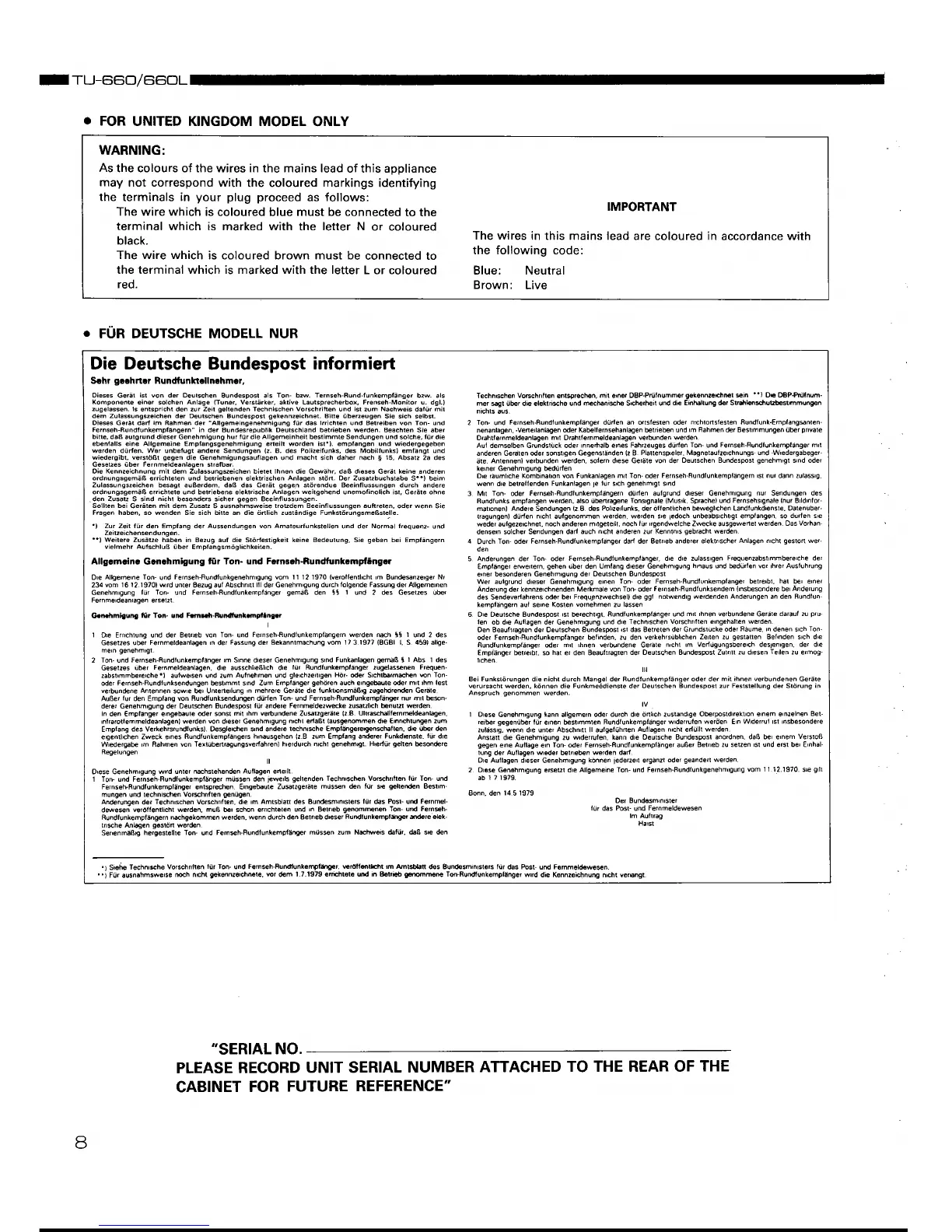 Denon TU-660 - Model Specific Information; UK Mains Lead Wiring; Serial Number Recording