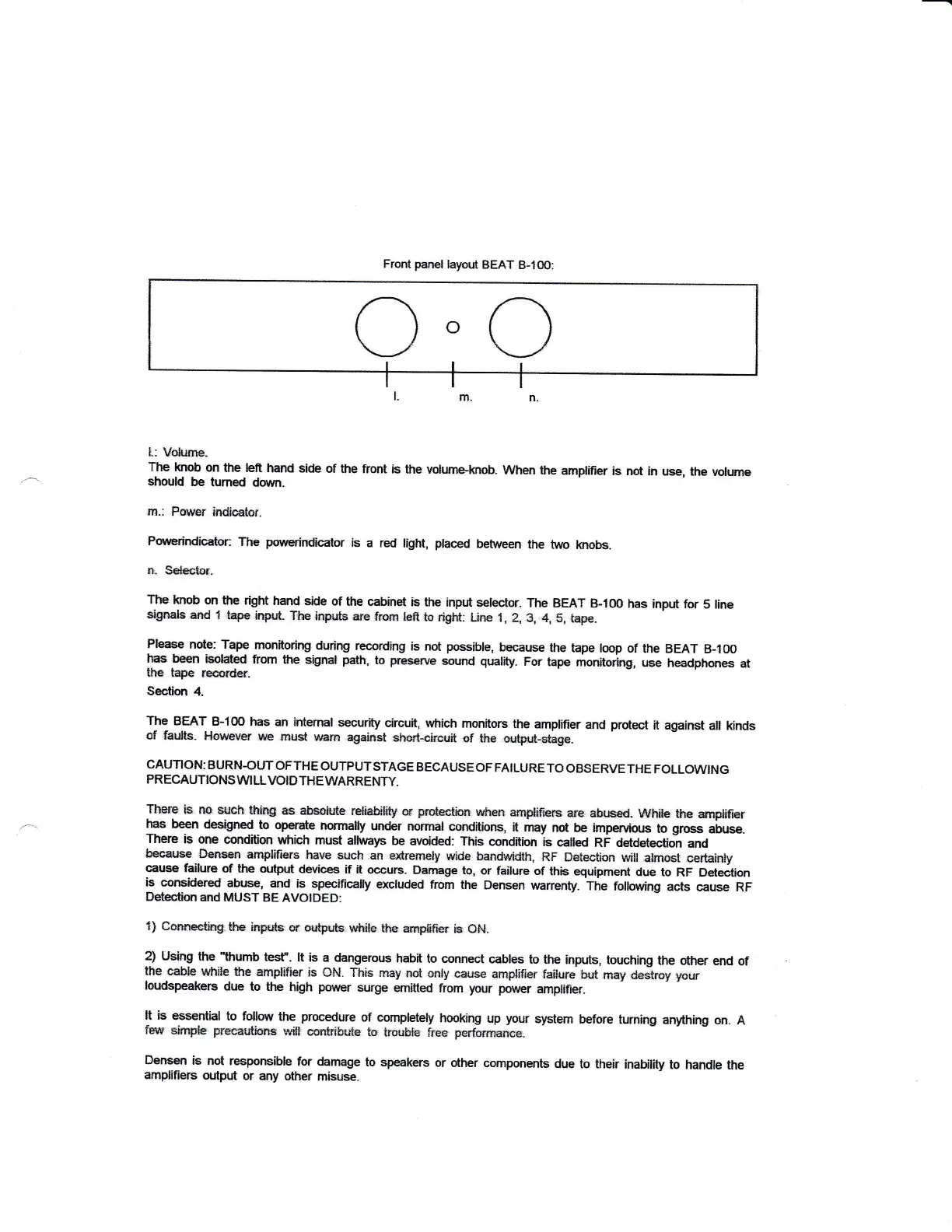 Densen BEAT B-100 - Front Panel Controls and Indicators; Volume Control; Input Selector Knob; Safety Precautions and Fault Avoidance