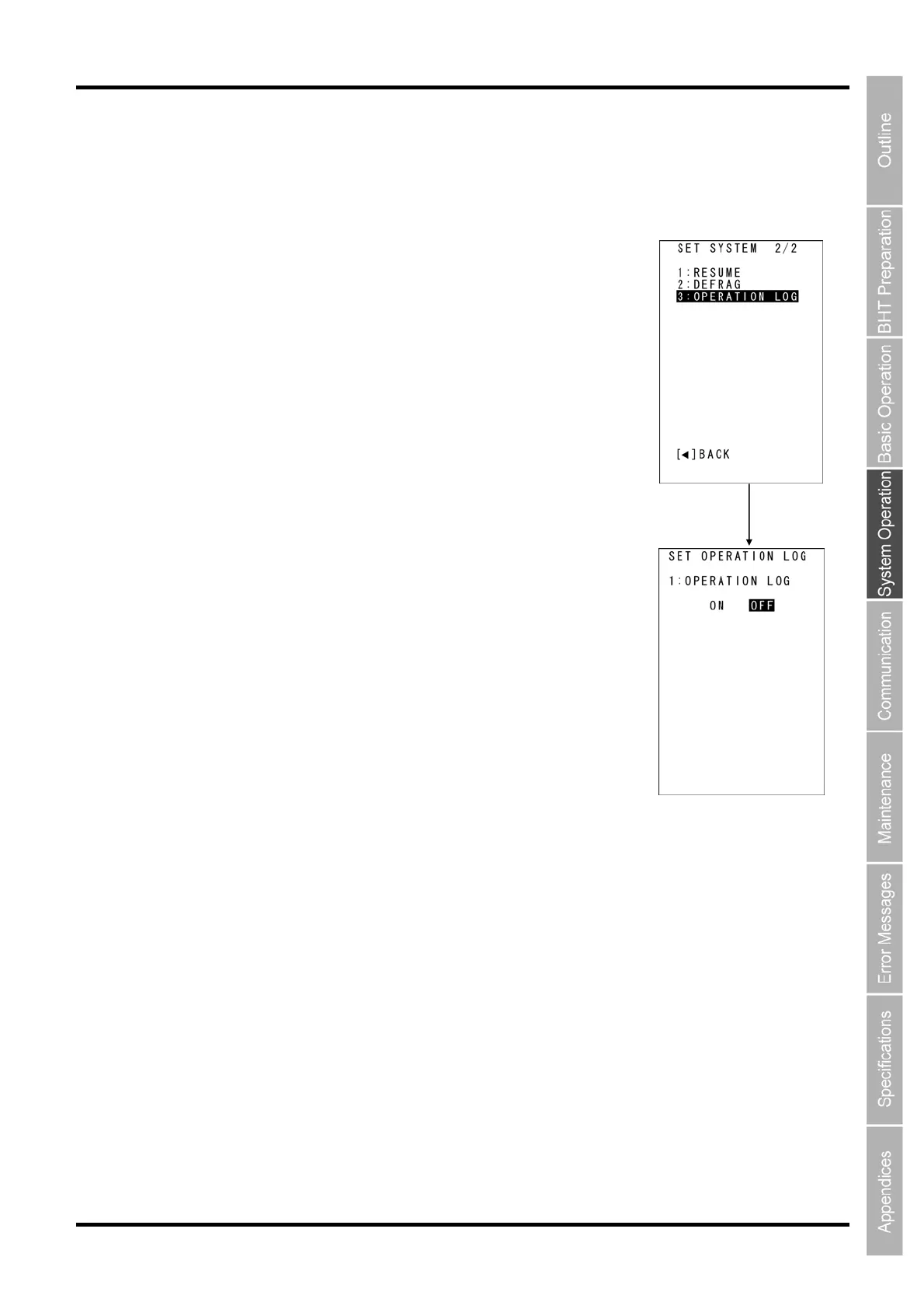 1. Select “3: OPERATION LOG” from the SET SYSTEM Menu 2/2 and