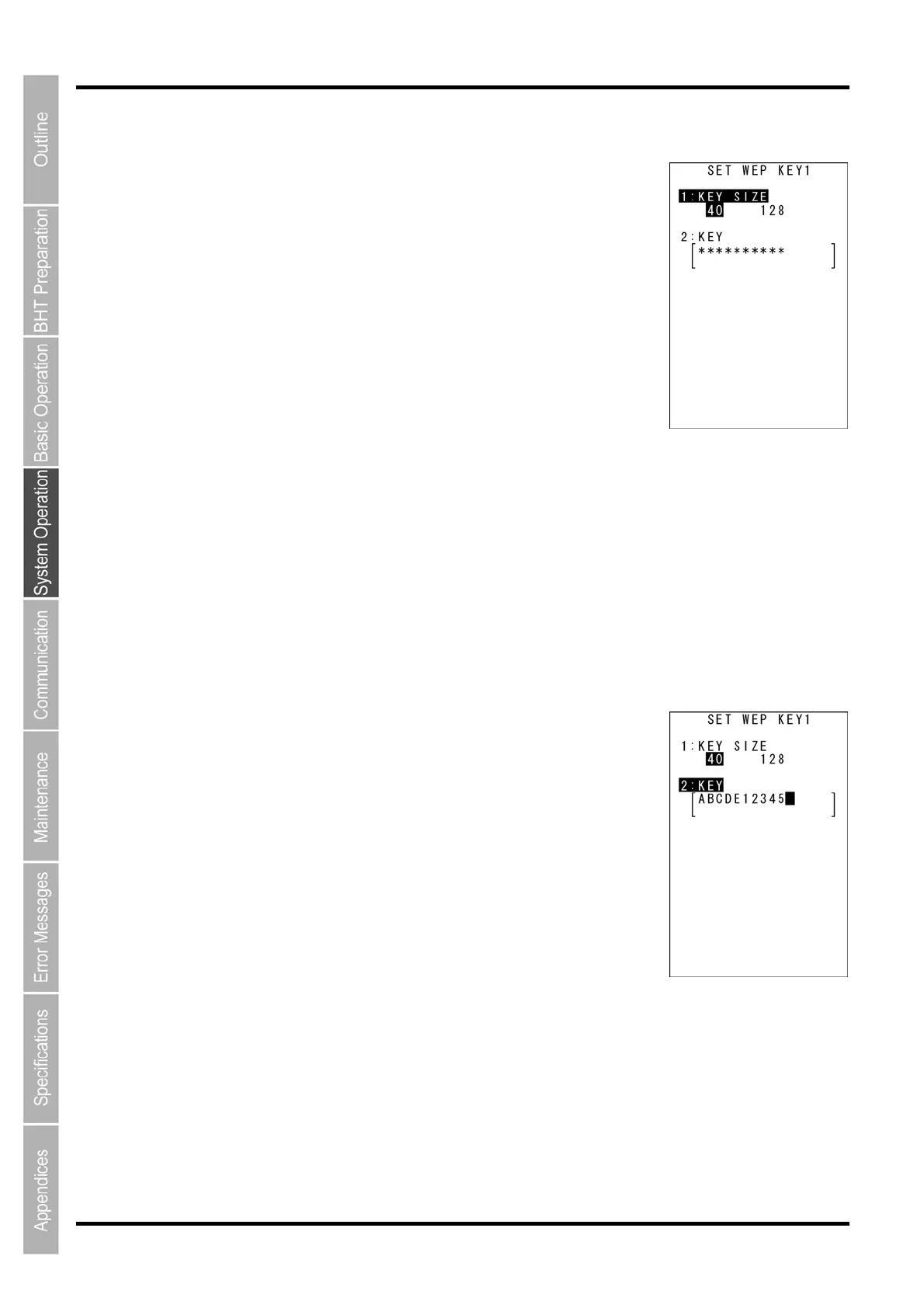 The screen on the right shows an example in which “40 bit” has been set for ”WEP KEY1” and the key