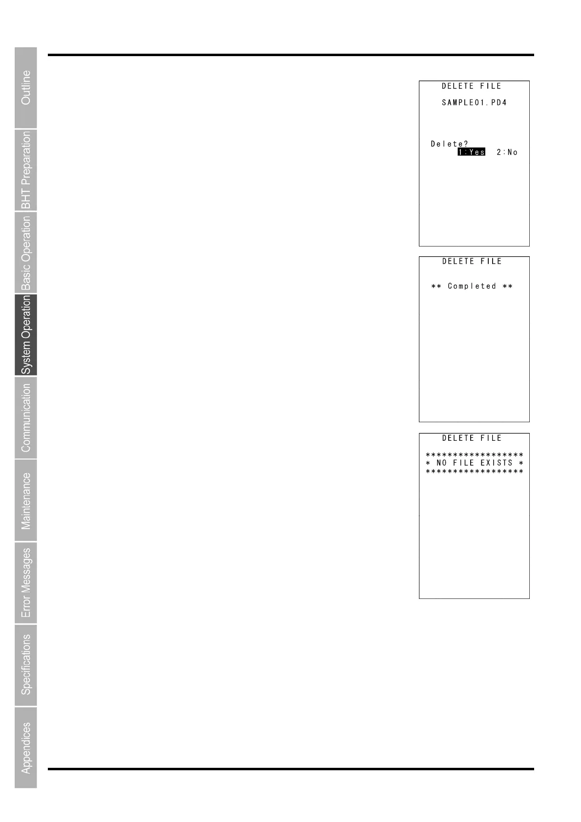 Press and hold the BS/C key to return to the DELETE FILE menu.