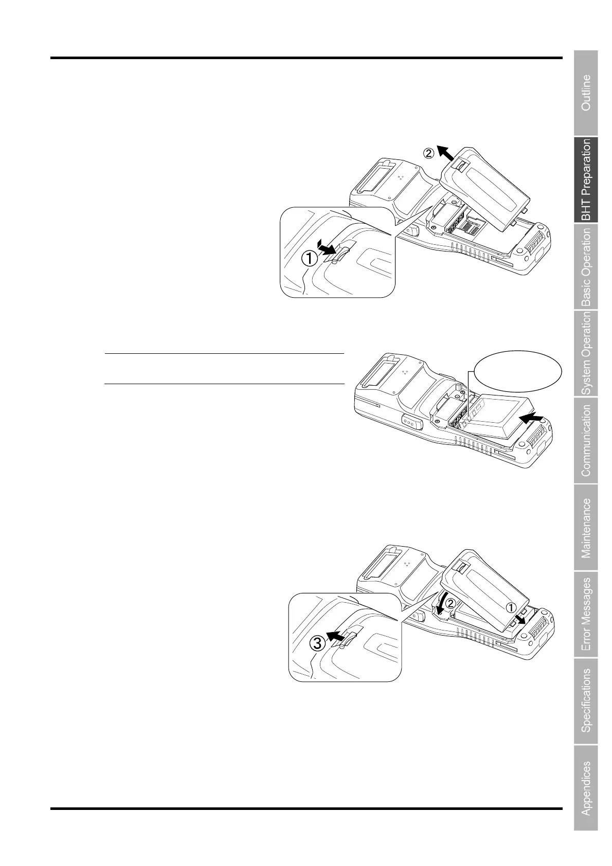 5. Check the battery cartridge terminals and indication on the BHT unit, and then insert the