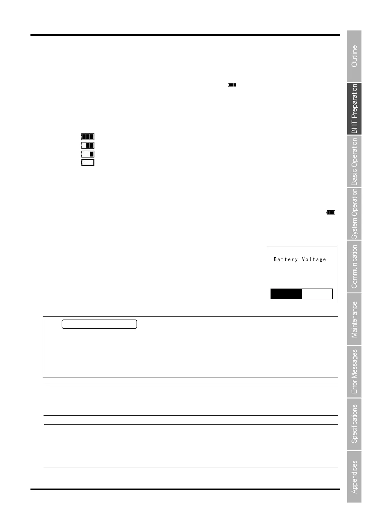 The "Battery Voltage" screen displays the battery power level in more detail than the battery icon ( )
