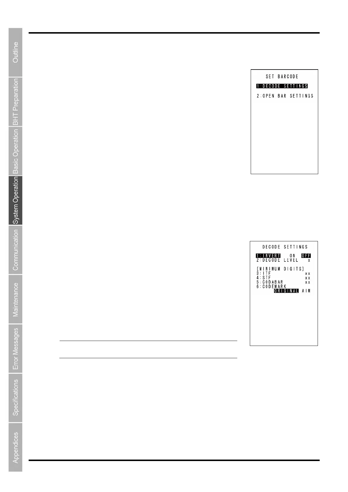 “1: DECODE SETTINGS”: Code reading conditions and minimum number of digits for