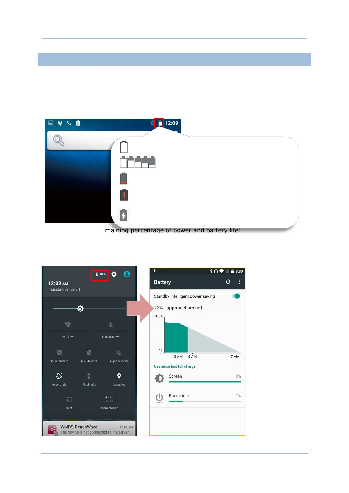 2) The percentage of remaining battery power is shown beside the battery icon; you can