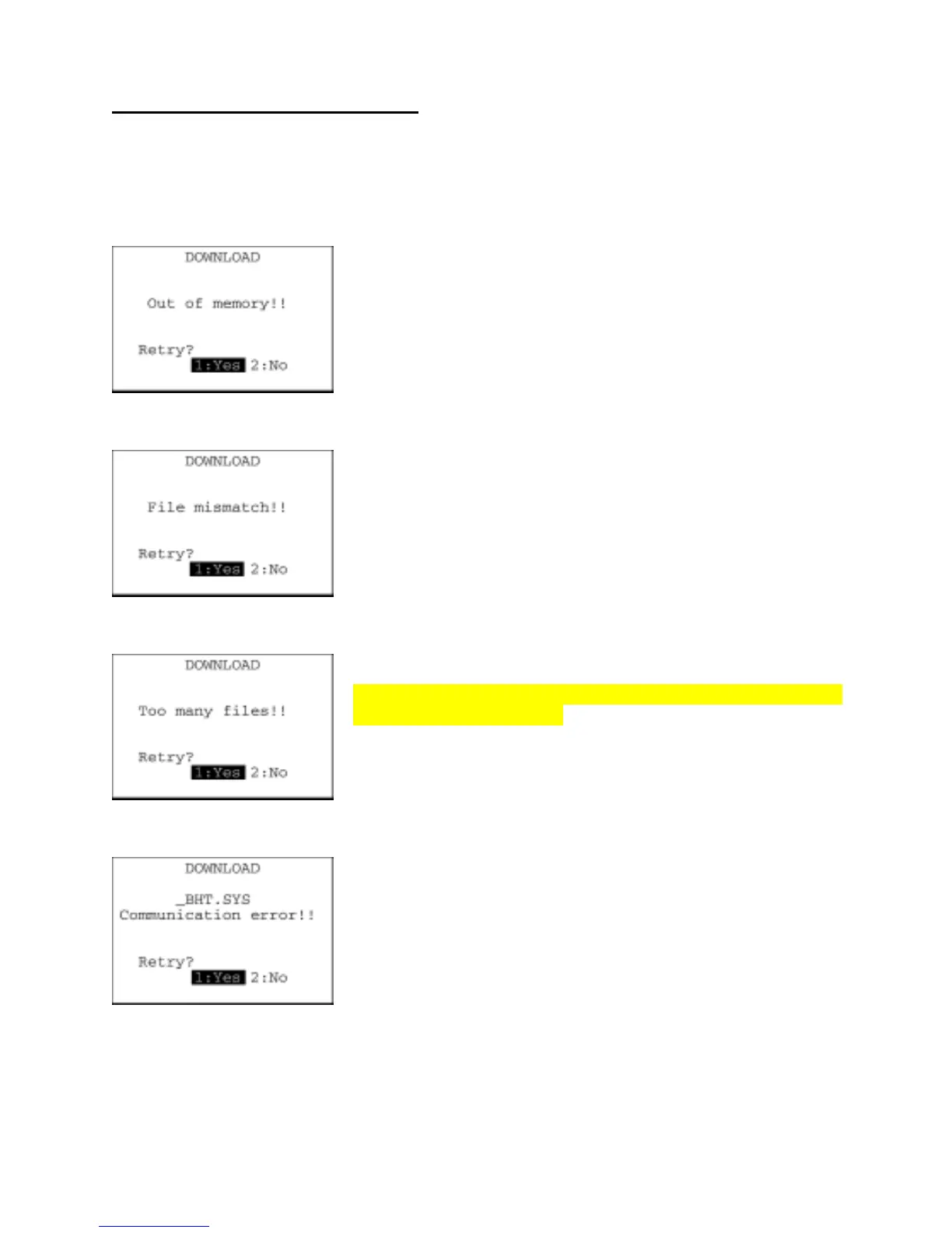 If some error occurs during downloading, the BHT beeps three times and shows one of the following