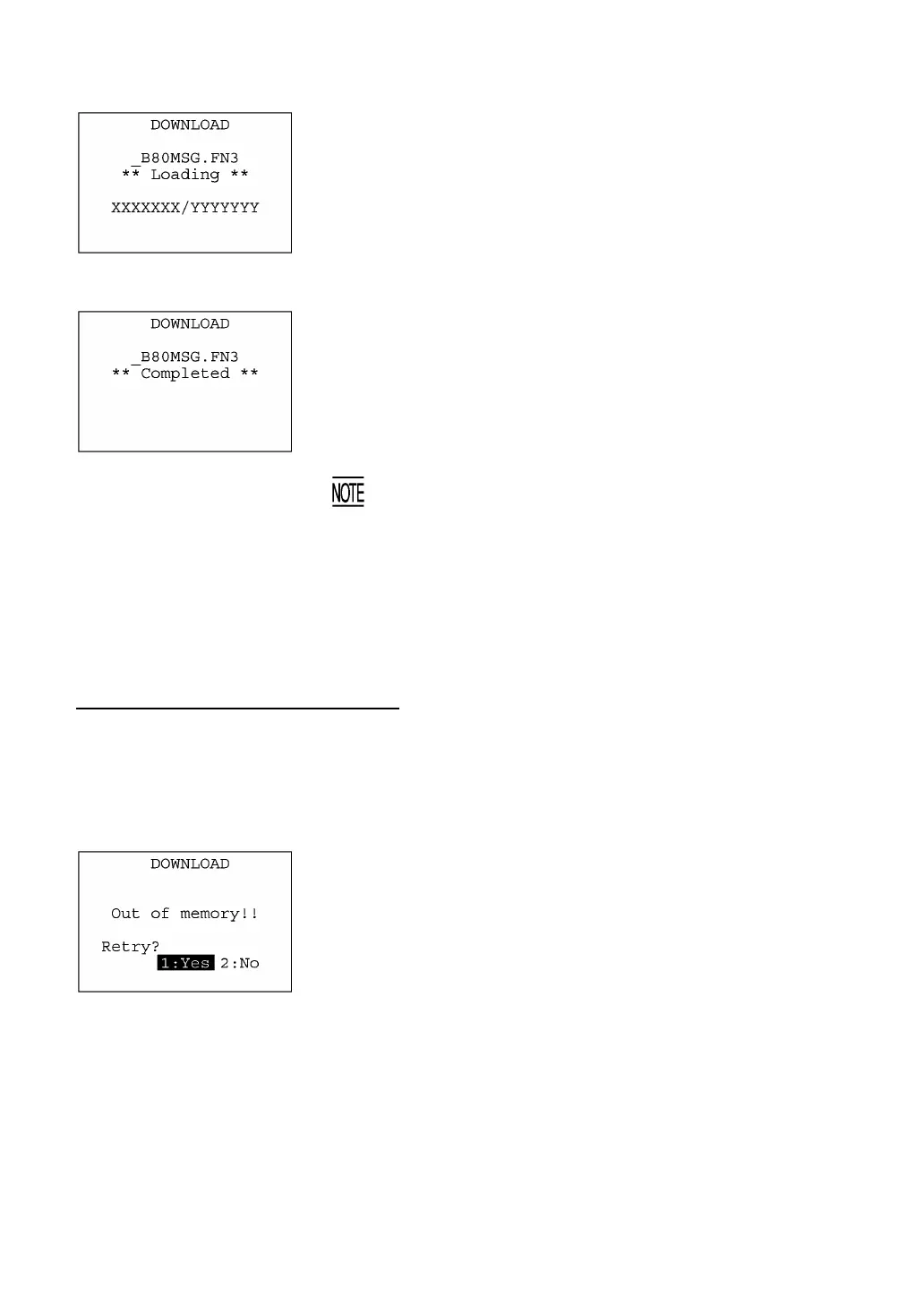To retry the download, press the 1 and ENT keys; to abort it, press the 2 and ENT keys.