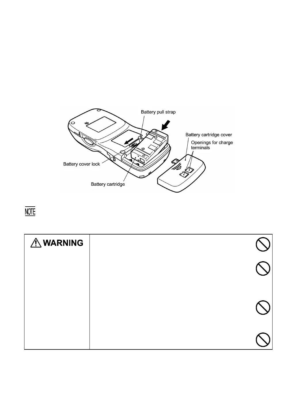(5) Put the battery cartridge cover back into place taking care not to pinch the battery pull strap between