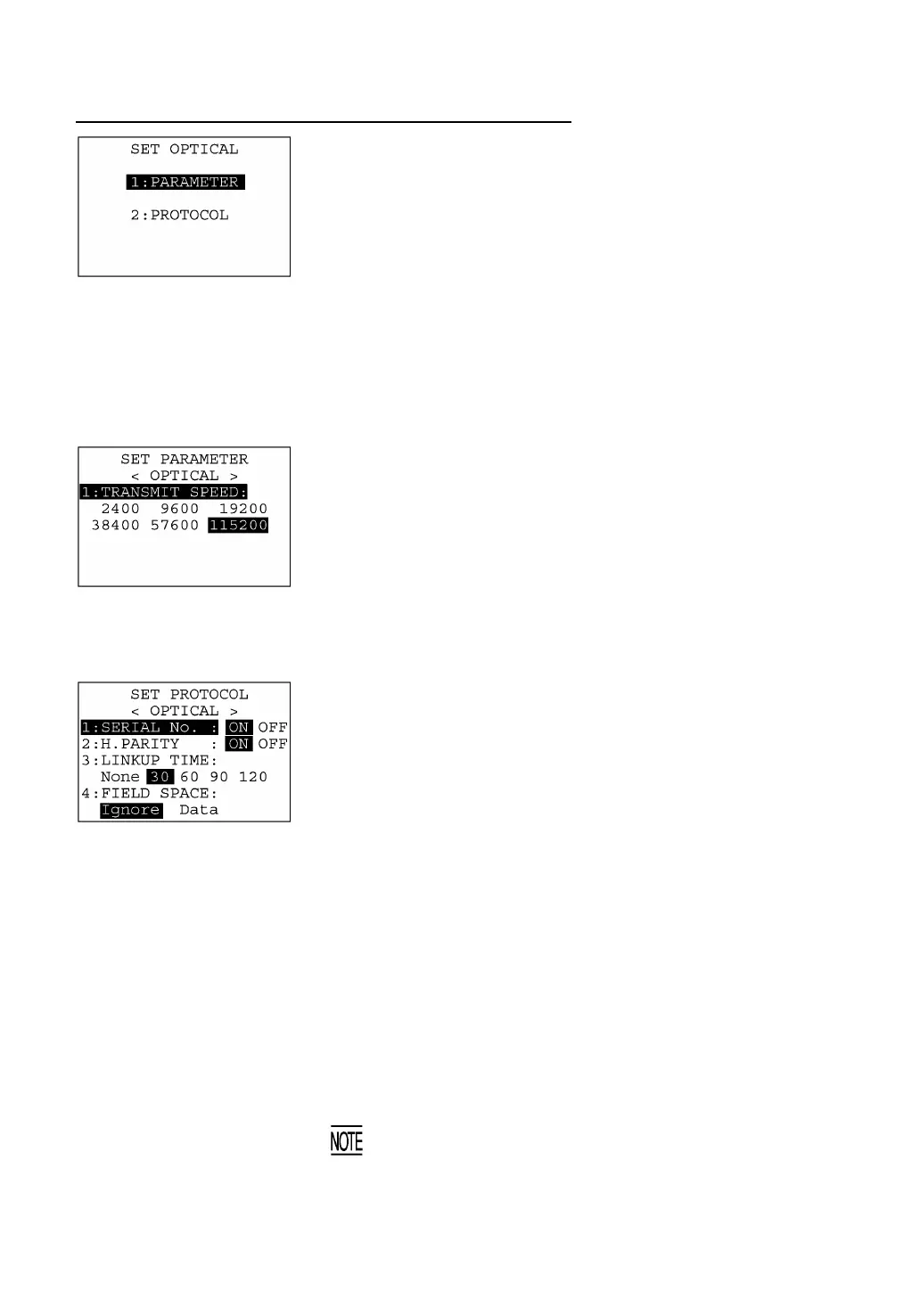 Selecting "2: PROTOCOL" on the SET OPTICAL screen calls up the