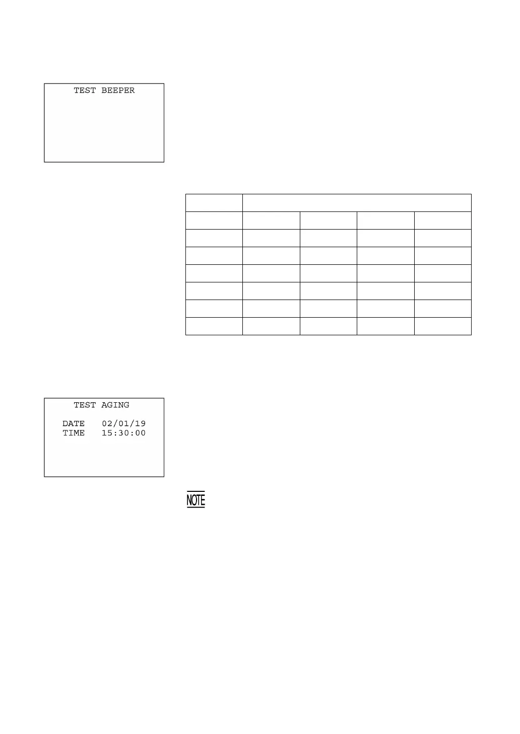 Selecting "4:AGING" on the TEST menu proceeds to the aging test