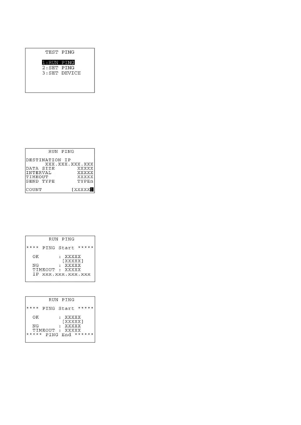 Selecting "1:RUN PING" on the TEST PING menu calls up the screen
