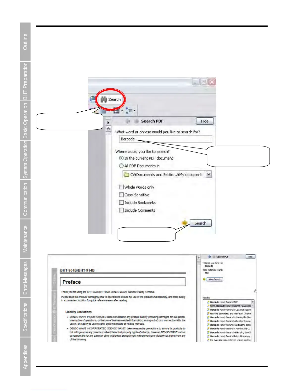 The PDF search function can be used to jump to the target page by entering words or characters related to the