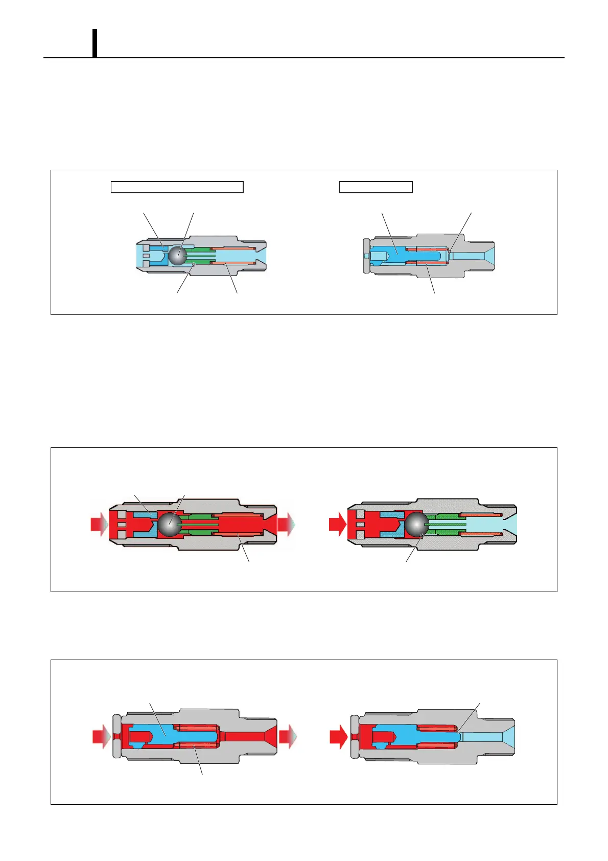 - The piston contacts the seat directly and the piston shuts off the fuel passage directly. Operation is the same as for