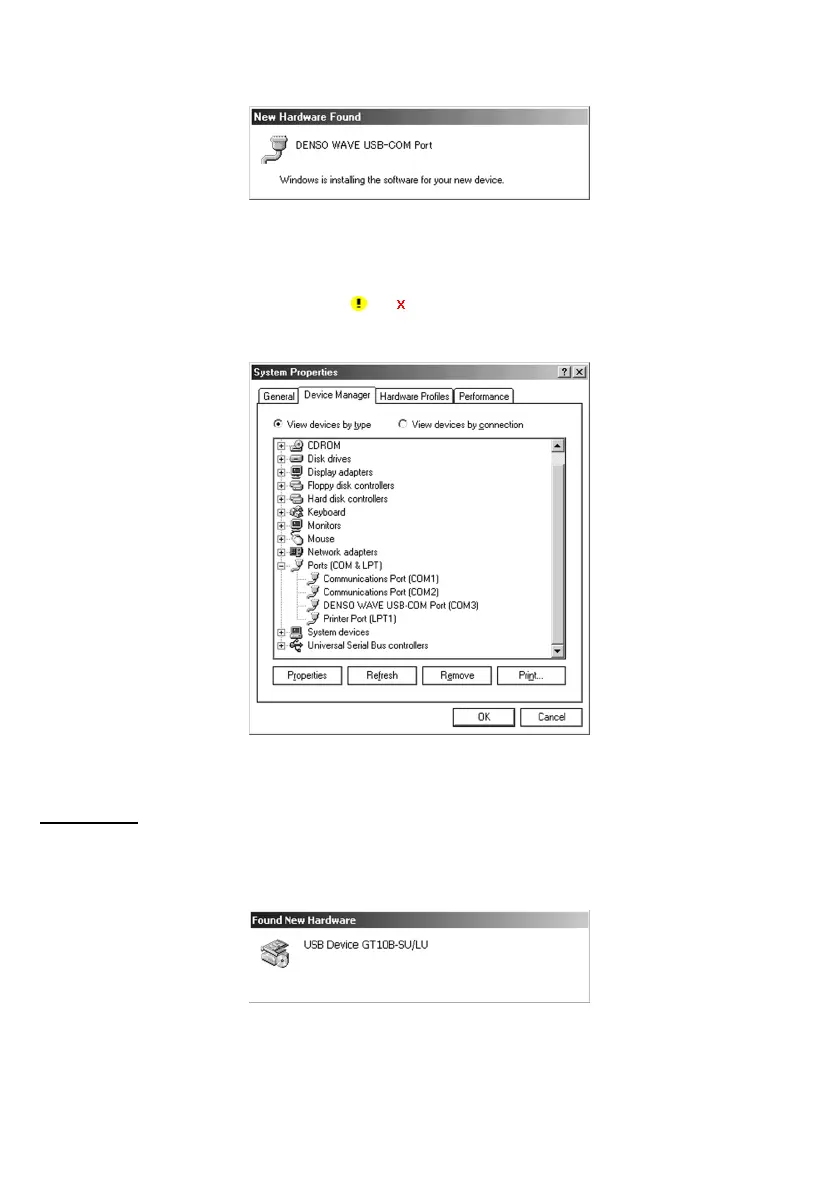 When copying driver files is finished, "New hardware found" messages for "Unknown device" and "DENSO WAVE
