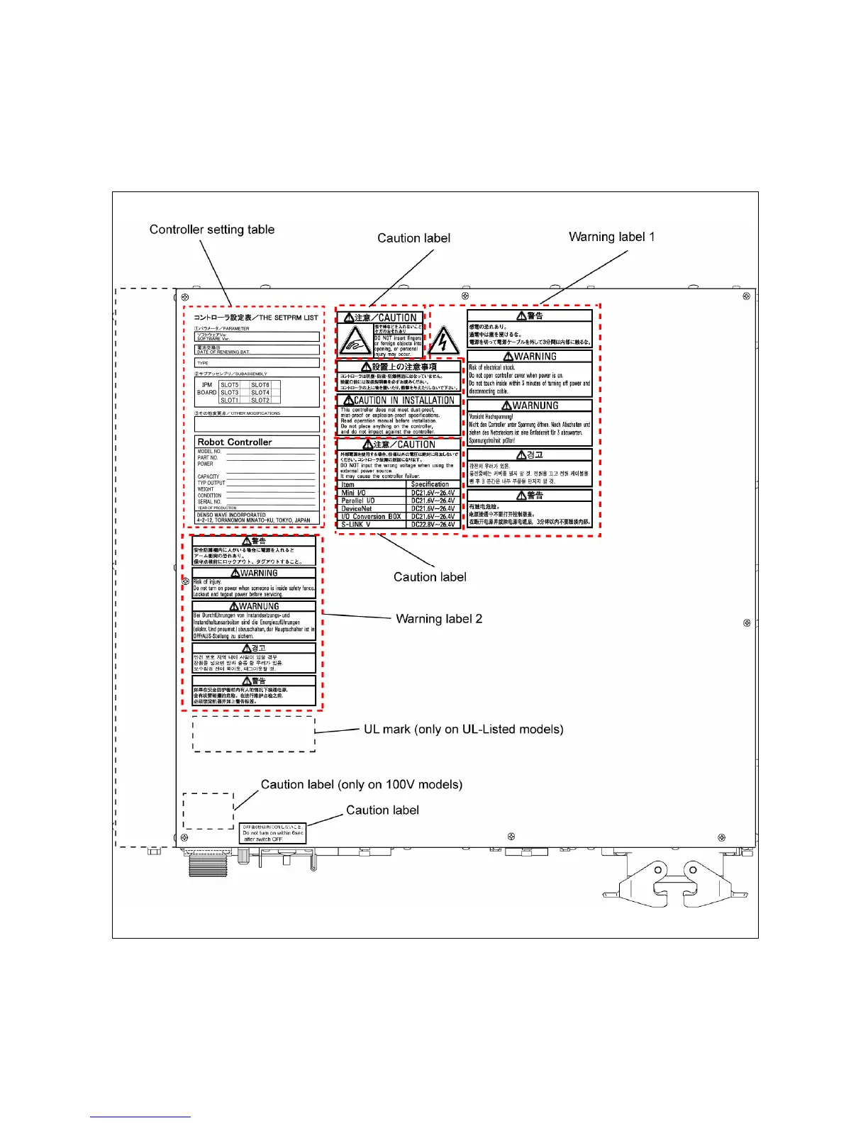 The robot unit has warning and caution labels pasted as shown below. They alert