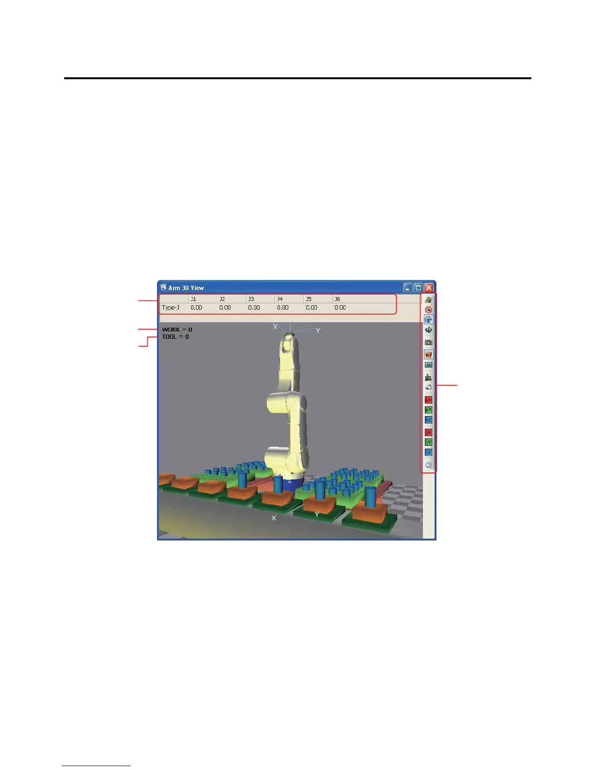 The Arm 3D view window displays, in three dimensions, the robot's current position and attitude.