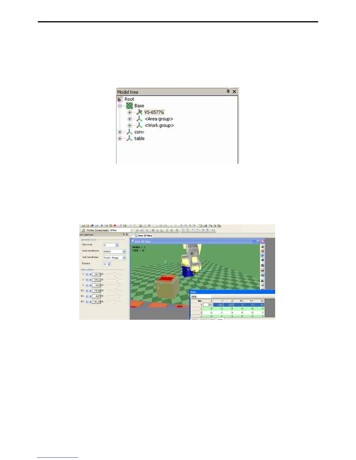 The Model tree window presents a hierarchical display of the objects in the Arm 3D view.