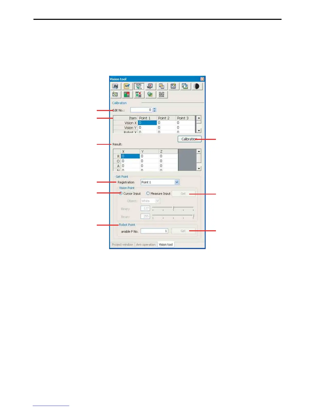 This table specifies the Vision monitor and robot coordinates for the calibration operation. The operation