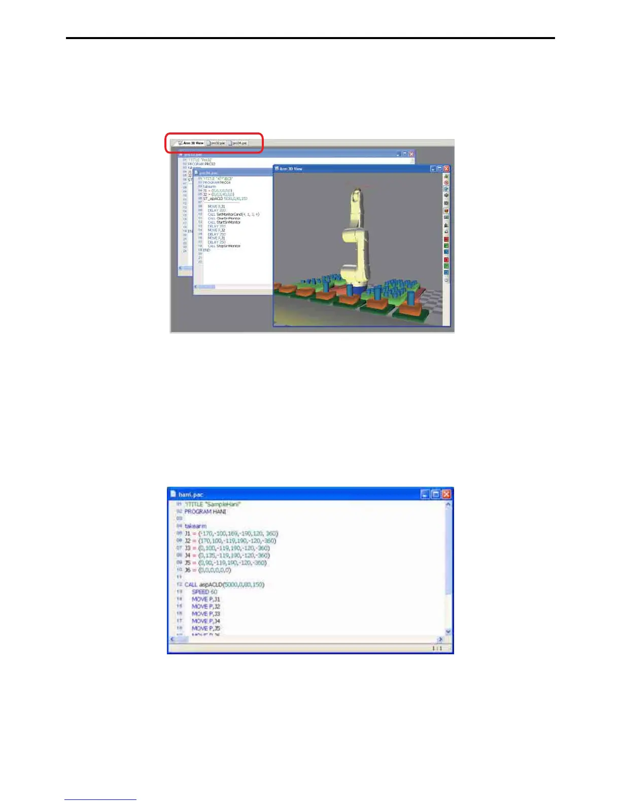 This displays the following window types: Arm 3D view, Vision monitor, and Program edit. If there is a robot con-