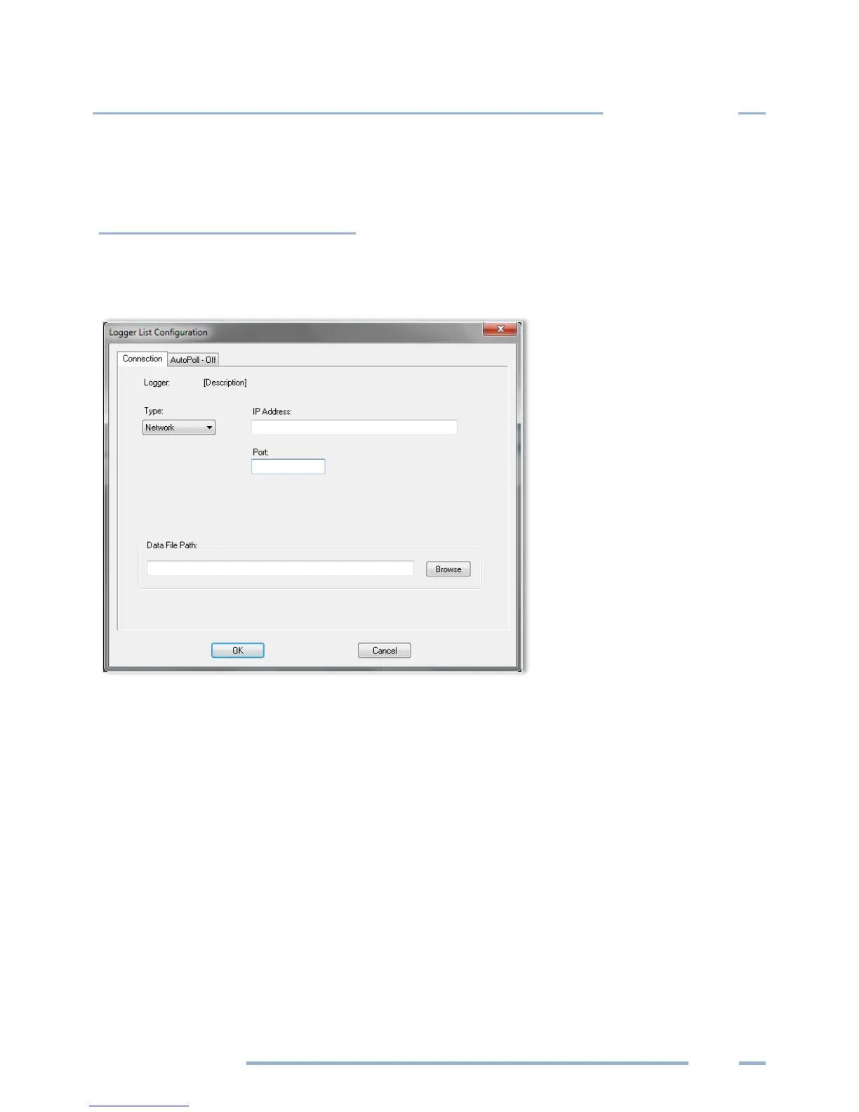 of the logger modem. For a network connection enter the IP address of the logger and the port