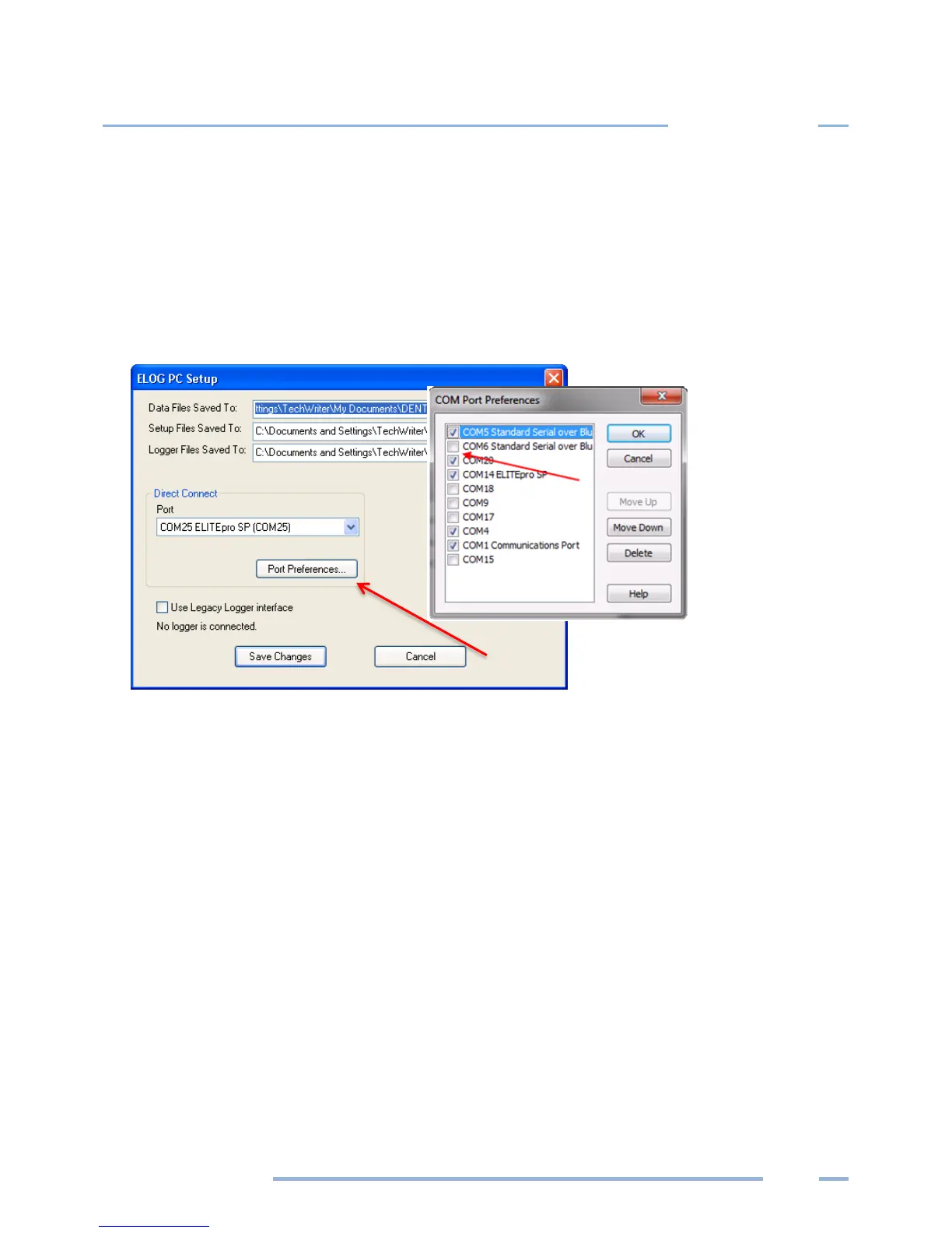 6) Reopen ELOG PC Setup and click the Port Preferences button. The COM Port Preferences dialog box