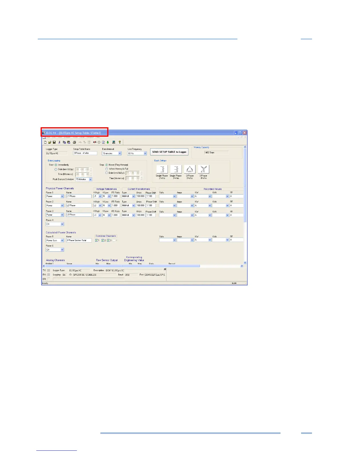 The setup table stored in the logger is retrieved and displayed, with the name of the file above the ELOG