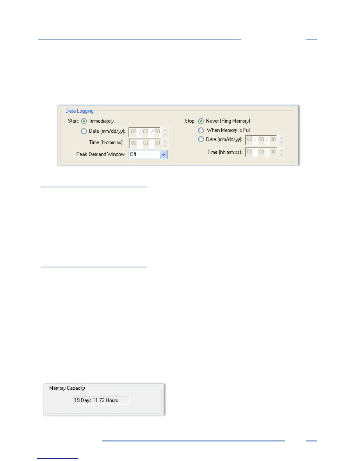 are Start Immediately and Stop Never (Ring Memory). Additional data logging options are defined