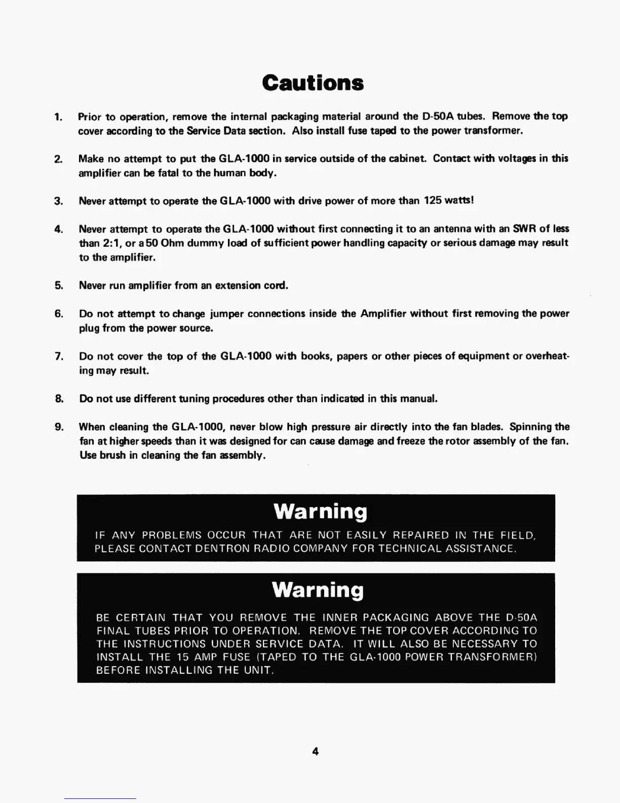 Dentron GLA-1000 - Cautions; General Operational Cautions