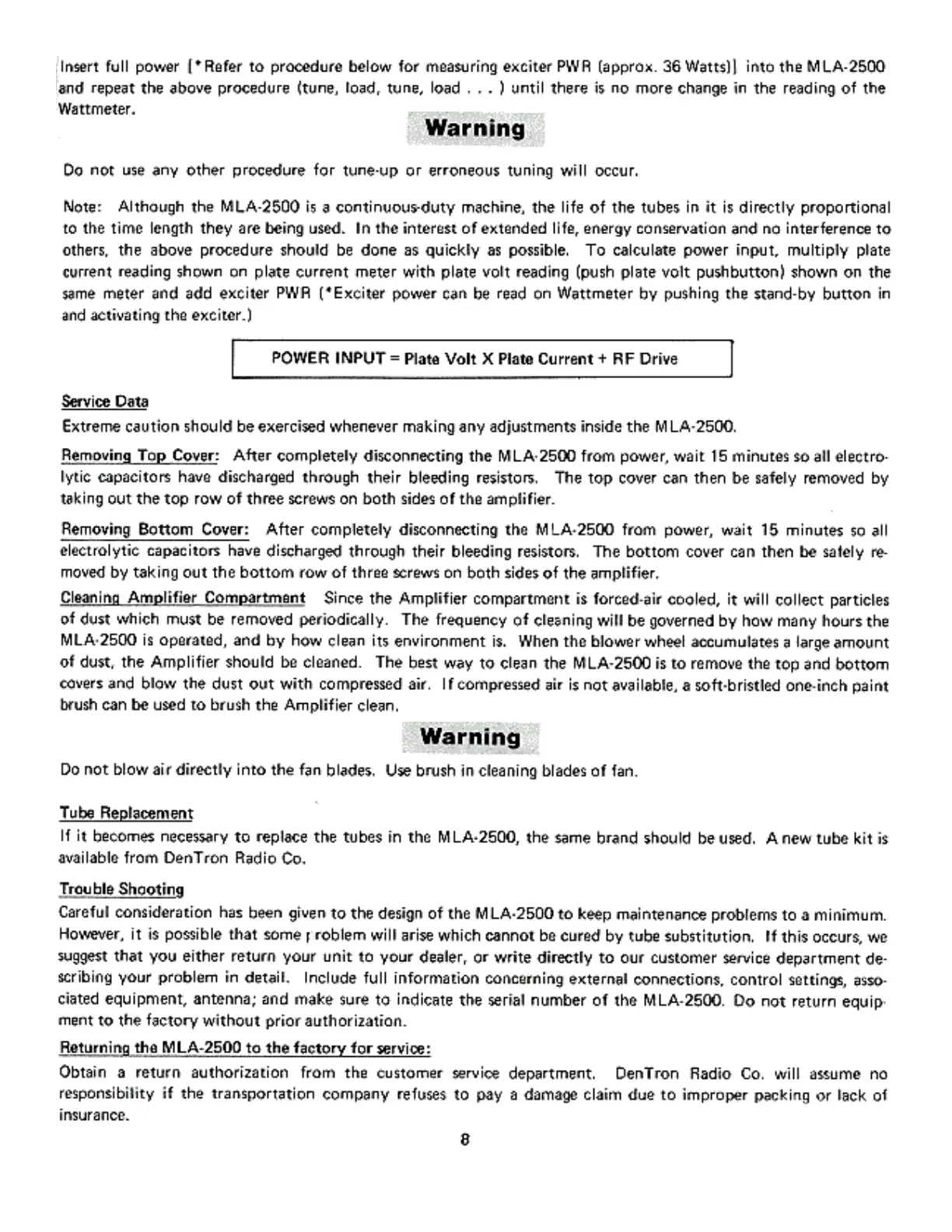 Dentron MLA 2500 - Service Data; Removing Top Cover; Removing Bottom Cover; Tube Replacement
