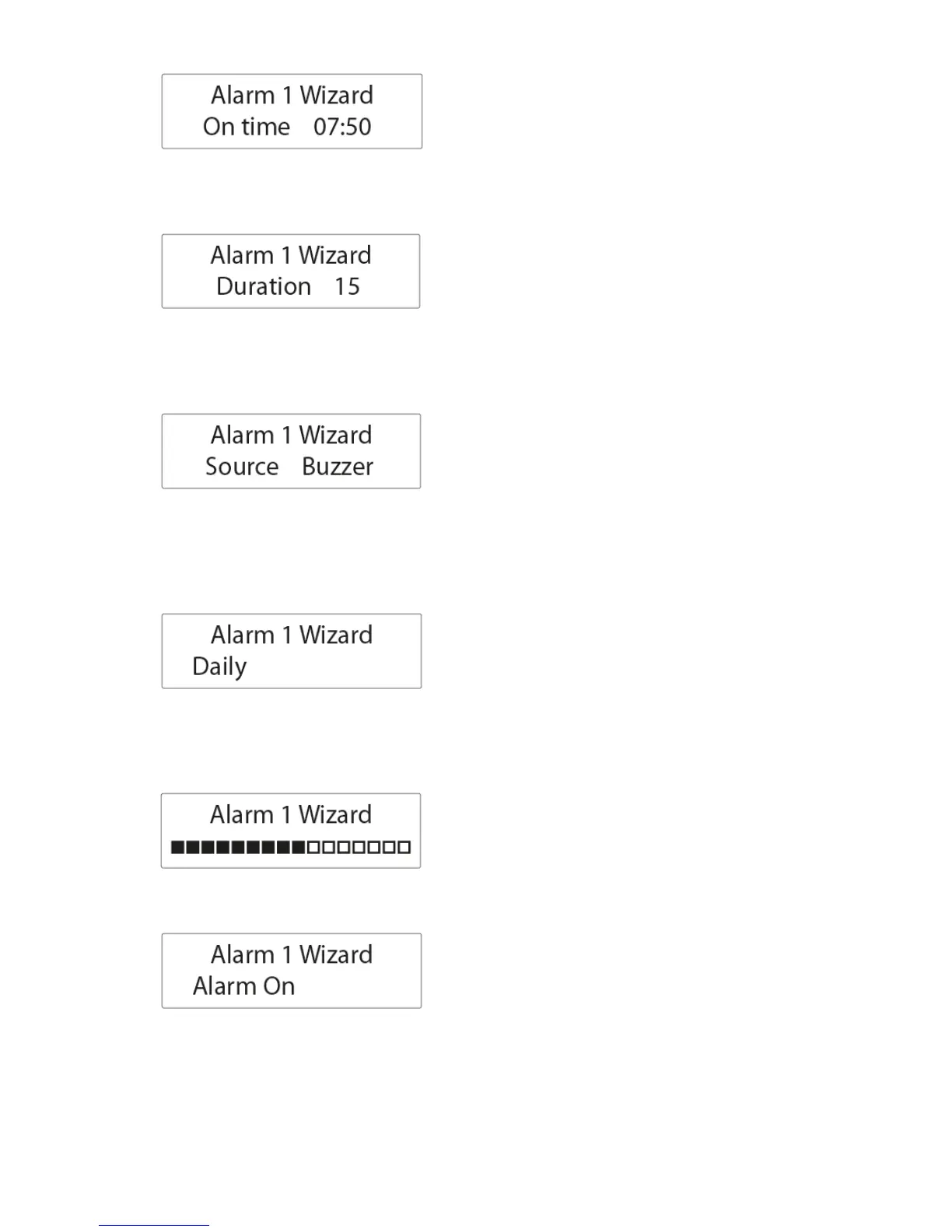 8. Press the BACKWARD or FORWARD button to select alarm on or off and then press
