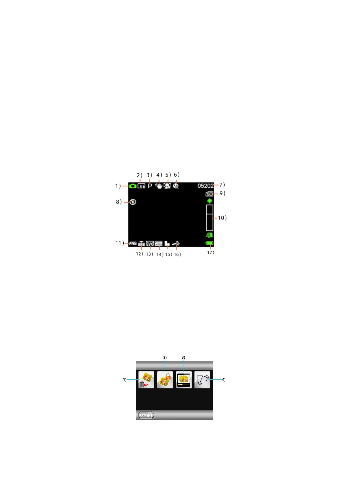 5) Ansigtsgenkendelse 6) Registrering af smil 7) Resterende antal billeder 8) blitzpære