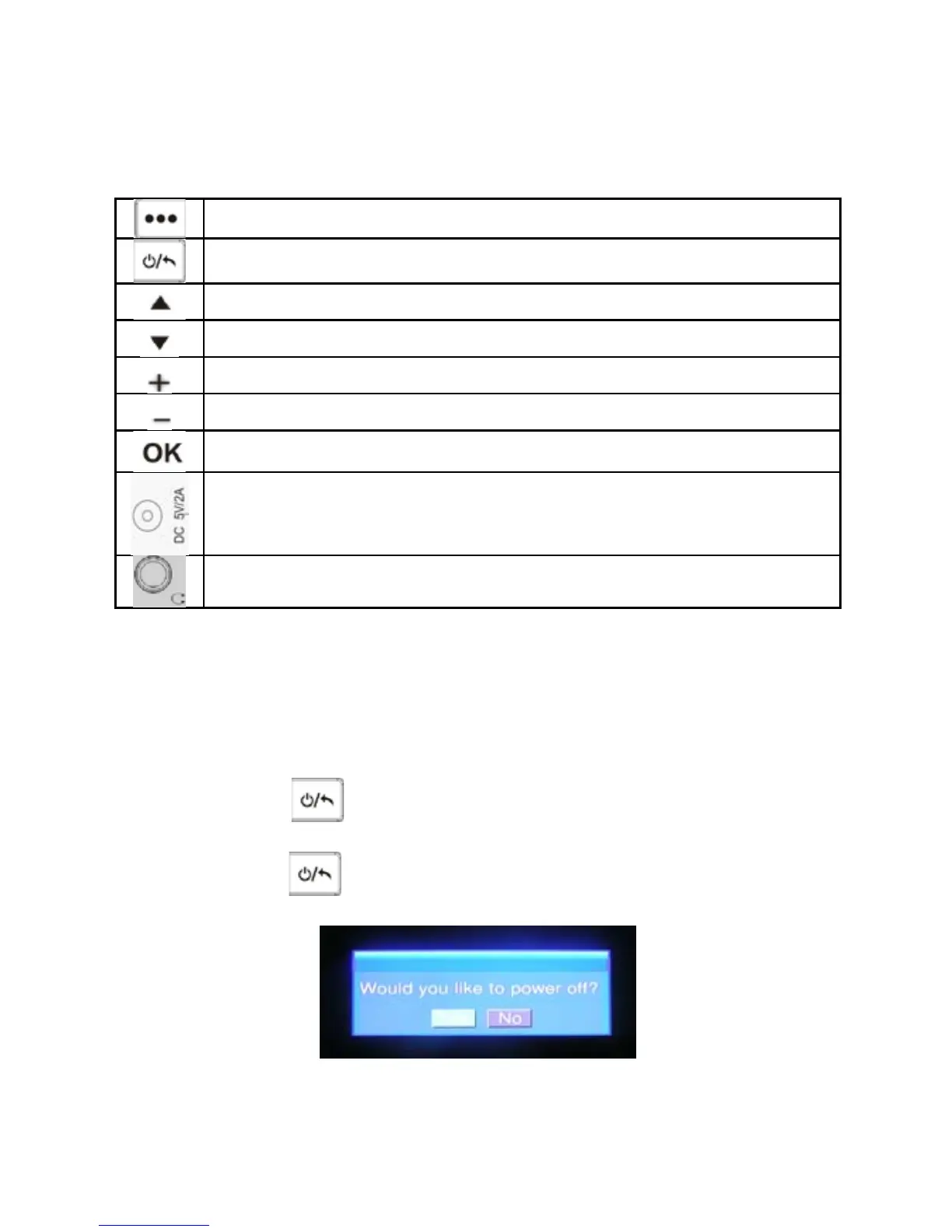 Power Off: Press button and hold for 3 seconds, the system will pop up